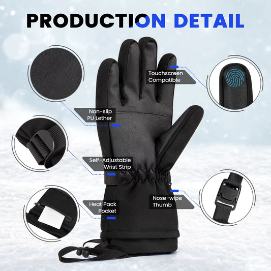 Ski Gloves, Touchscreen Snowboard Gloves with Pocket, Waterproof Snow Gloves for Cold Weather, Winter Gloves Warm for Men & Women, Suitable for Driving/Cycling/Running/Hiking(Black)