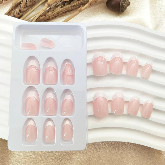 White French Tip Press on Nails - Short Oval Fake Nails for Daily Wear - Simple Glue on Light Pink Full Cover False Almond Acrylic Stick on Nails for Women - 24 Pcs