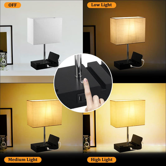 Bedside Table Lamp for Bedroom with Dual Fast USB Charging Ports, Fully Dimmable Nightstand Lamps with 2 Phone Stands and 2 Charging Outlets, Desk Lamp with Fabric Shade for Living Room